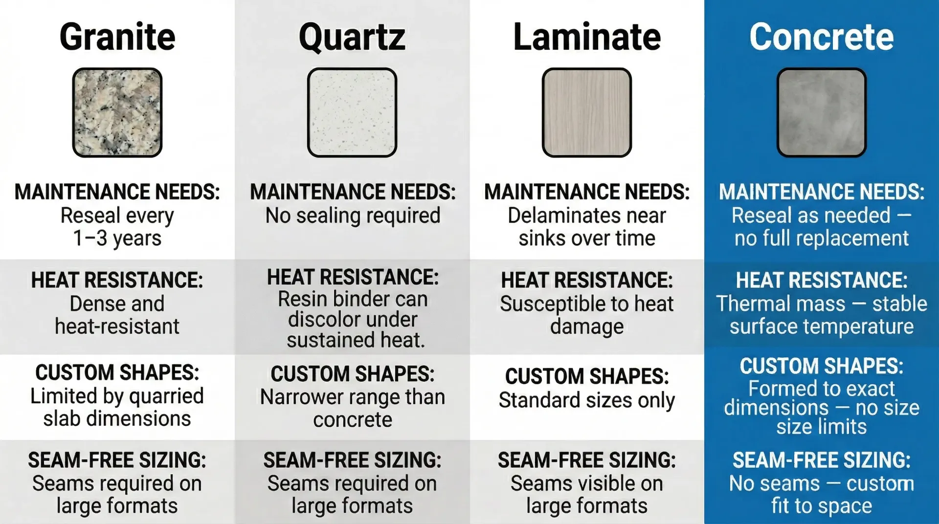 In a kitchen, concrete's thermal mass works in its favor. The material absorbs and releases heat gradually, staying at a stable surface temperature, while being more tolerant of brief heat exposure than quartz resin surfaces.